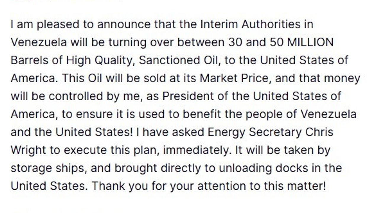 ABD Başkanı Donald Trump, Venezuela'daki geçici yönetimin yaptırım altındaki 30 ila 50 milyon varil arasında yüksel kaliteli petrolü ABD'ye devredeceğini açıkladı. Trump, piyasa fiyatından satılacak bu petrolden elde edilecek gelirin kendi kontrolünde olacağını söyledi.