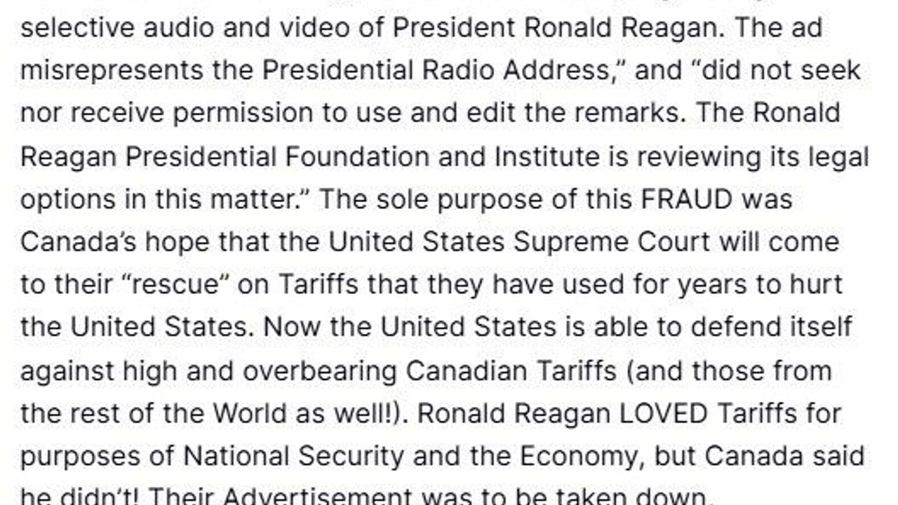 ABD Başkanı Donald Trump, Kanada’nın eski ABD Başkanı Ronald Reagan’ın gümrük vergileri konusundaki konuşmasını çarpıtan reklamı yayından kaldırmamasına tepki göstererek, "Gerçekleri ciddi şekilde çarpıtmaları ve düşmanca davranışları nedeniyle, Kanada’ya uygulanan gümrük vergisi oranını yüzde 10 oranında artırıyorum" açıklamasında bulundu.
