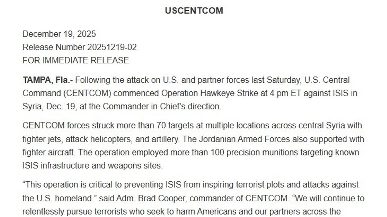 CENTCOM Komutanı Amiral Brad Cooper, Suriye'deki DEAŞ unsurlarını hedef alan son operasyonun DEAŞ'ın ABD'ye yönelik terörist planlarını ve saldırılarını önleme konusunda kritik öneme sahip olduğunu vurgulayarak, 'Amerikalıları ve bölgedeki ortaklarımıza zarar vermek isteyen teröristleri amansızca takip etmeye devam edeceğiz' açıklamasında bulundu.