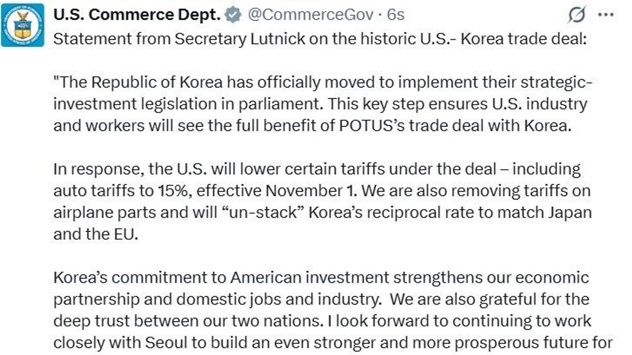 Bu adım karşısında ABD'nin de harekete geçtiğini ifade eden Lutnick, Washington'un da Güney Kore'den ithal edilen otomobillere uygulanan yüzde 25'lik gümrük vergisinde indirime gideceğini belirtti. ABD Ticaret Bakanı Howard Lutnick, 'Buna karşılık ABD 1 Kasım'dan itibaren otomobil gümrük vergilerinin yüzde 15'e indirilmesi de dahil belirli gümrük vergilerini düşürecek. Ayrıca uçak parçalarındaki gümrük vergilerini kaldırıyoruz ve Güney Kore'nin karşılıklı tarife oranı Japonya ve AB ile aynı seviyeye getirilecek' dedi.