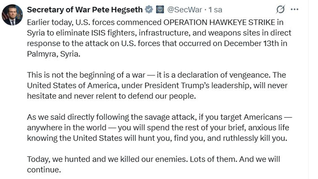 ABD Savunma Bakanı Pete Hegseth ise, sosyal medya platformu X üzerinden yaptığı açıklamada ABD'nin bugün erken saatlerde Suriye'de 'Hawkeye Strike Operasyonu'nu (Şahin Gözü Operasyonu) başlattığını duyurdu. Bu operasyonun 13 Aralık'ta Suriye'nin Tedmur (Palmira) bölgesinde ABD güçlerine yönelik gerçekleştirilen saldırıya doğrudan bir yanıt olduğunun altını çizen Hegseth, 'Operasyon, DEAŞ savaşçılarını, altyapısını ve silah mevzilerini ortadan kaldırmayı amaçlamaktadır' dedi. Bu operasyonun bir savaş başlangıcı değil, intikam ilanı olduğunu kaydeden Hegseth, 'Başkan Trump'ın liderliği altındaki ABD, halkını savunma konusunda asla tereddüt etmeyecek ve asla geri adım atmayacaktır' ifadelerini kullandı. ABD'yi ve halkını hedef alan herkesin dünyanın neresinde olursa olsun bulunup yok edileceğini vurgulayan Hegseth, 'Bugün düşmanlarımızı avladık ve öldürdük. Hem de çok sayıda. Ve buna devam edeceğiz' dedi.