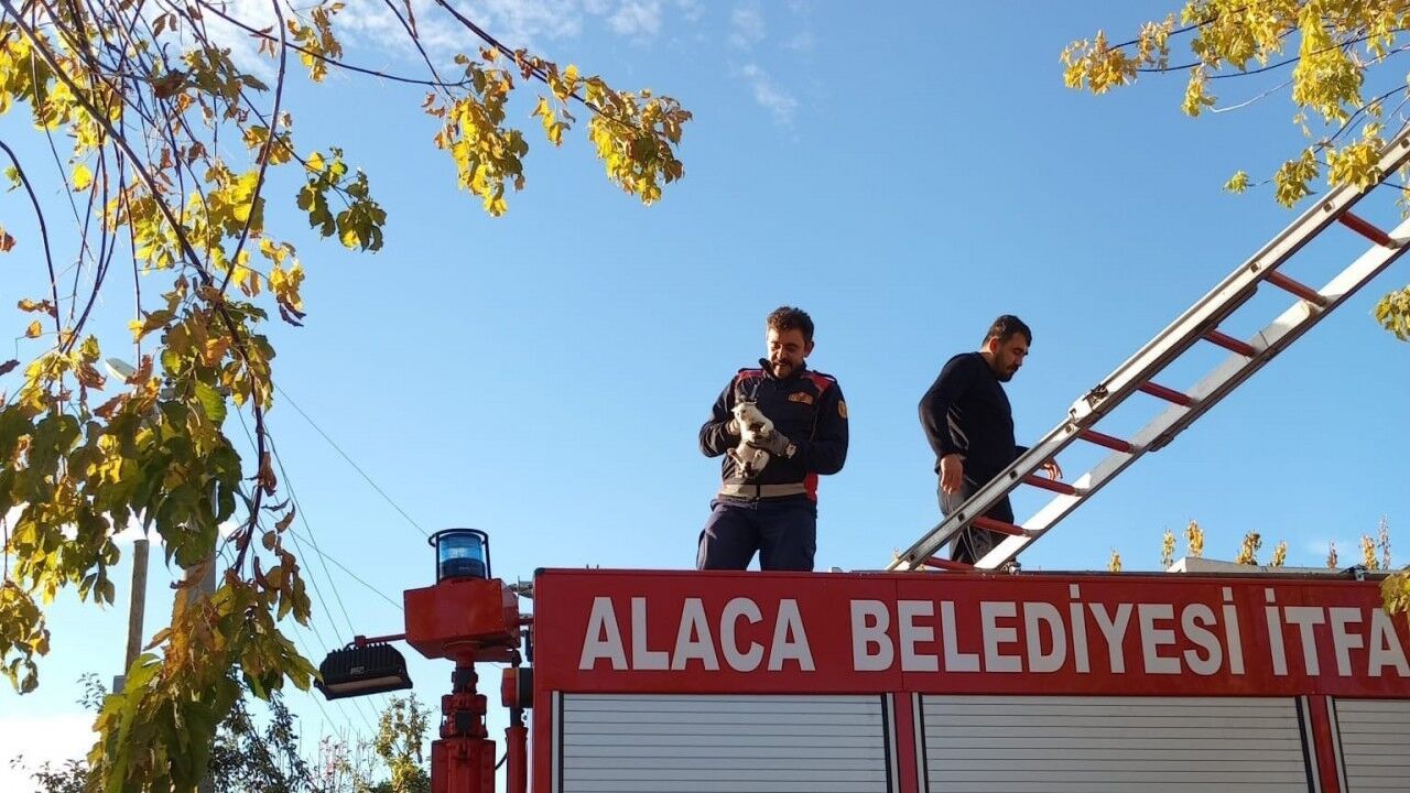 Alaca ilçesi Necmettin Erbakan Parkı’nda tırmandığı ağacın dalında mahsur kalan yavru kediyi fark eden vatandaşlar, durumu 112 Acil Çağrı Merkezi’ne bildirdi. İhbar üzerine bölgeye gelen Alaca Belediyesi itfaiye ekipleri, merdiven yardımıyla kediyi bulunduğu yerden indirdi. Kurtarılan yavru kedi, sağlık durumunun iyi olduğu belirlenmesinin ardından doğal yaşam alanına bırakıldı.