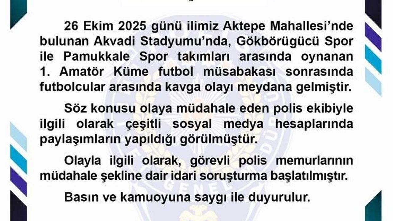 Olaya ilişkin Denizli İl Emniyet Müdürlüğü’nün yaptığı yazılı açıklamada, "26 Ekim 2025 günü ilimiz Aktepe Mahallesi’nde bulunan Akvadi Stadyumu’nda, Gökbörügücü Spor ile Pamukkalespor takımları arasında oynanan 1. Amatör Küme futbol müsabakası sonrasında futbolcular arasında kavga olayı meydana gelmiştir. Söz konusu olaya müdahale eden polis ekibiyle ilgili olarak çeşitli sosyal medya hesapları ve basında paylaşımların yapıldığı görülmüştür. Olayla ilgili olarak, görevli polis memurlarının müdahale şekline dair idari soruşturma başlatılmıştır" ifadeleri yer aldı.