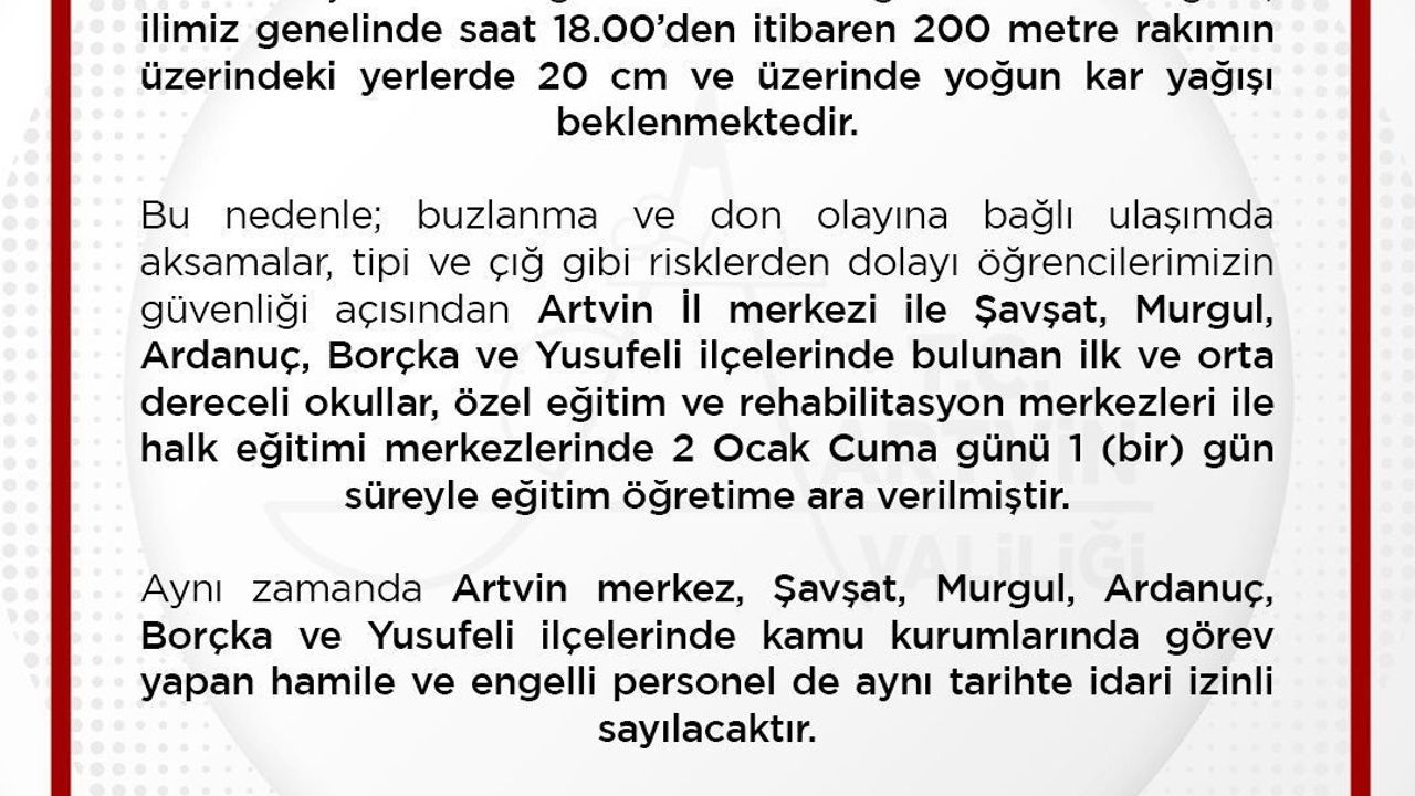 Valilikten yapılan açıklamada, saat 18.00'den itibaren 200 metre rakımın üzerindeki bölgelerde 20 santimetre ve üzeri yoğun kar yağışı beklendiği, buna bağlı olarak buzlanma, don, tipi ve çığ riskinin oluşabileceği belirtildi. Öğrencilerin güvenliği dikkate alınarak Artvin il merkezi ile Şavşat, Murgul, Ardanuç, Borçka ve Yusufeli ilçelerinde 2 Ocak Cuma günü; ilk ve orta dereceli okullar, özel eğitim ve rehabilitasyon merkezleri ile halk eğitim merkezlerinde eğitim-öğretime 1 gün süreyle ara verildiği bildirildi.
