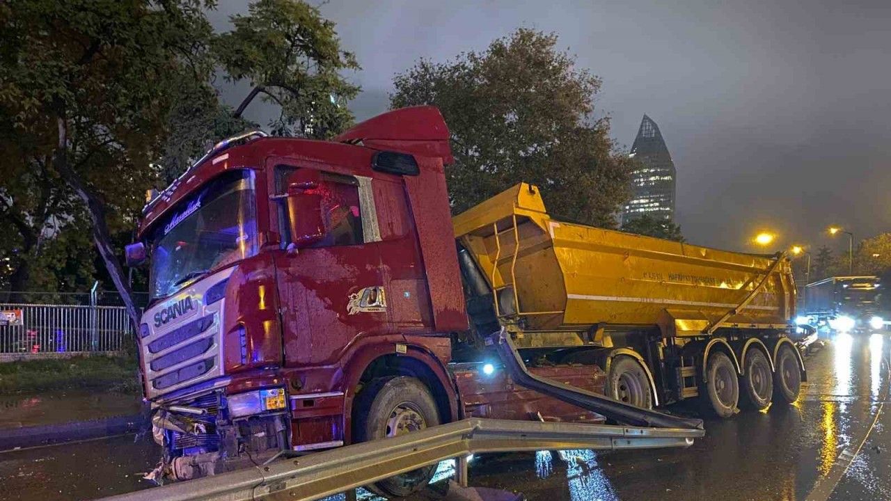İstanbul Ataşehir’de yağış nedeniyle kayganlaşan yolda virajı dönerken kontrolden çıkan hafriyat yüklü kamyon bariyerlere çarptı.