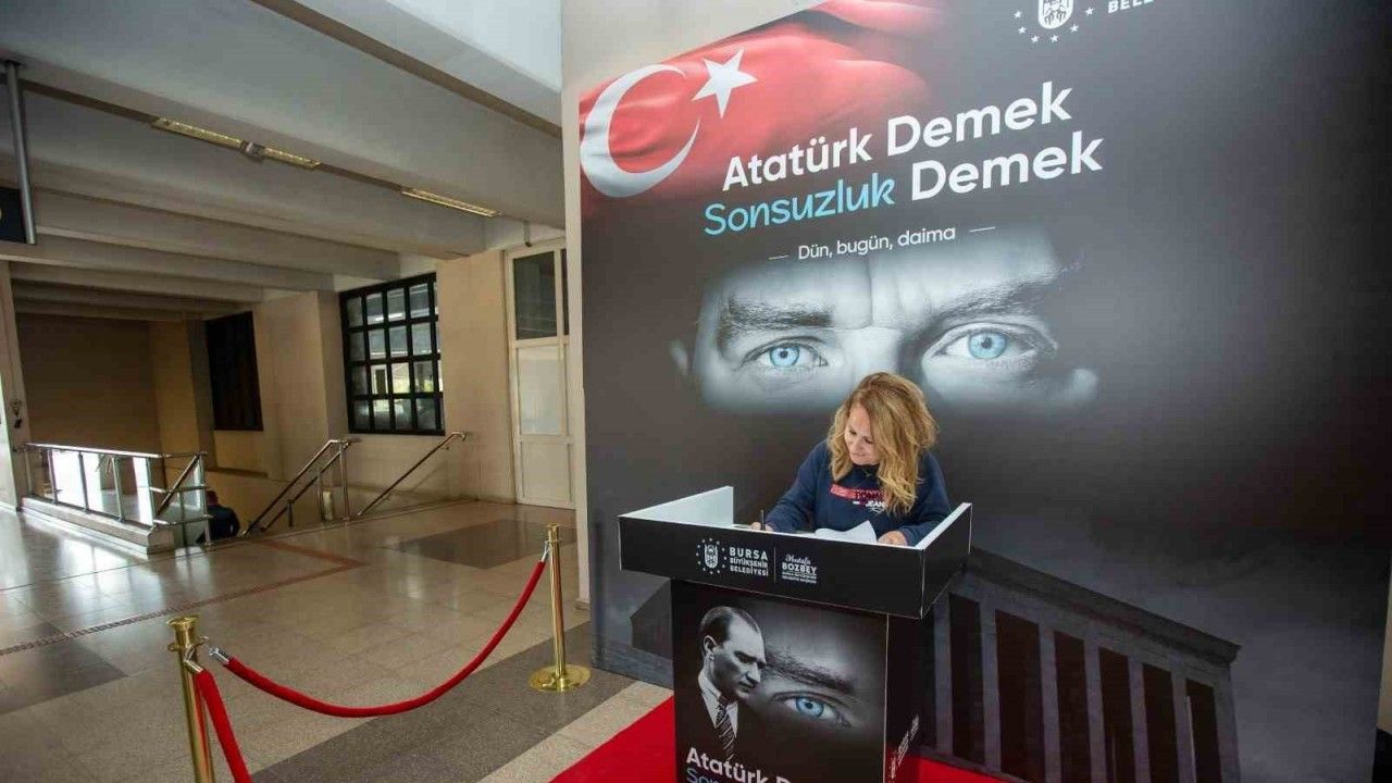 Mustafa Kemal Atatürk’ün aramızdan ayrılışının 87. yıl dönümünde Bursa’da kalpler ve kalemler, Büyükşehir Belediyesi’nin projesi ile bir araya geliyor. Bursalılar, Ata’ya duydukları özlem ve sevgilerini Büyükşehir Belediyesi’nin kentin farklı noktalarına kurduğu anı defteri stantlarıyla satırlara döküyor.