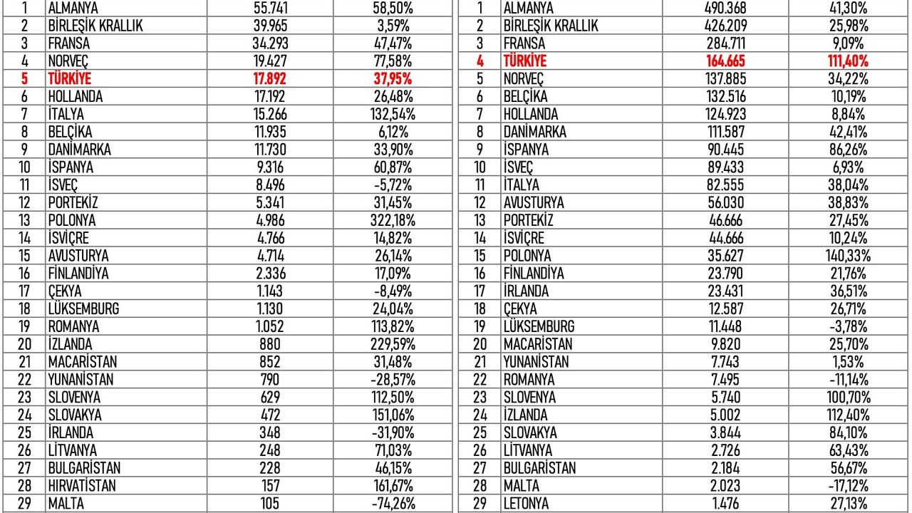 Raporda Almanya, Birleşik Krallık ve Fransa toplam satışlarda ilk üç sırayı alırken, Türkiye'nin toplam adet bazında bu ülkeleri takip ettiği belirtildi. Pazar payında ise Norveç, Danimarka ve İzlanda gibi ülkeler yüksek penetrasyon oranlarıyla listenin üst sıralarında yer aldı.