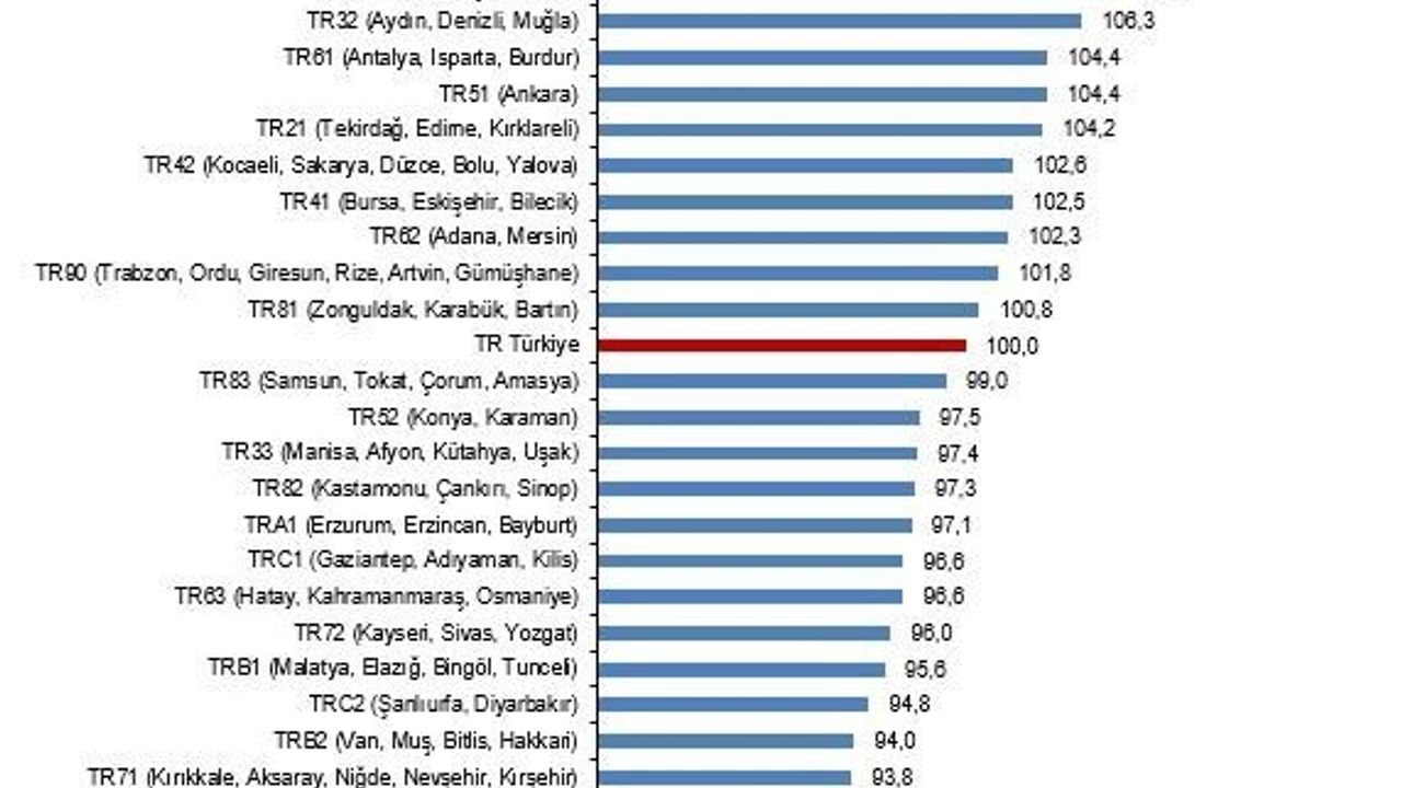 İstatistiki Bölge Birimleri Sınıflaması (İBBS) 2. Düzey esas alınarak hazırlanan çalışmada, ortak bir mal ve hizmet sepeti üzerinden bölgesel fiyat düzeyleri hesaplandı. Endeks değerinin 100'ün üzerinde olması, ilgili bölgenin Türkiye ortalamasına kıyasla daha pahalı olduğunu gösteriyor.