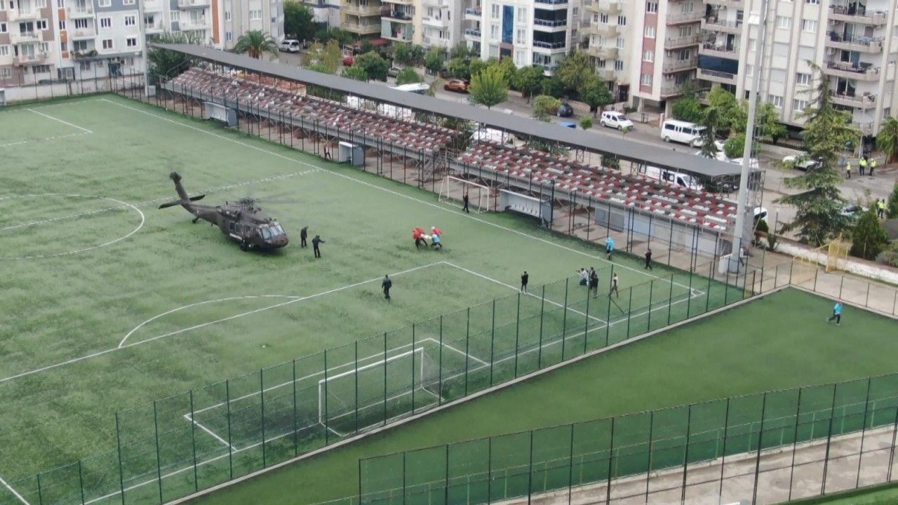 Aydın Valiliği koordinesinde gerçekleştirilen helikopter destekli saha tatbikatında, ekipler senaryo gereği tribün çökmesi sonucu 202 kişinin yaralandığı, 5 kişinin hayatını kaybettiği olaya müdahale etti.