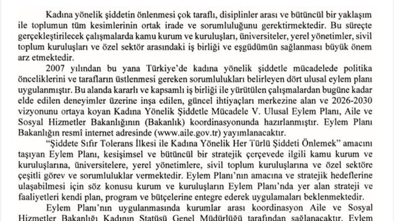 Aile ve Sosyal Hizmetler Bakanı Mahinur Özdemir Göktaş, "2026-2030 dönemini kapsayan ‘Kadına Yönelik Şiddetle Mücadele 5’inci Ulusal Eylem Planımız’, Resmi Gazete’de yayımlanarak yürürlüğe girdi. Cumhurbaşkanımız Recep Tayyip Erdoğan’ın ortaya koyduğu ‘sıfır tolerans’ ilkesini her şeyin üzerinde görüyoruz" dedi.