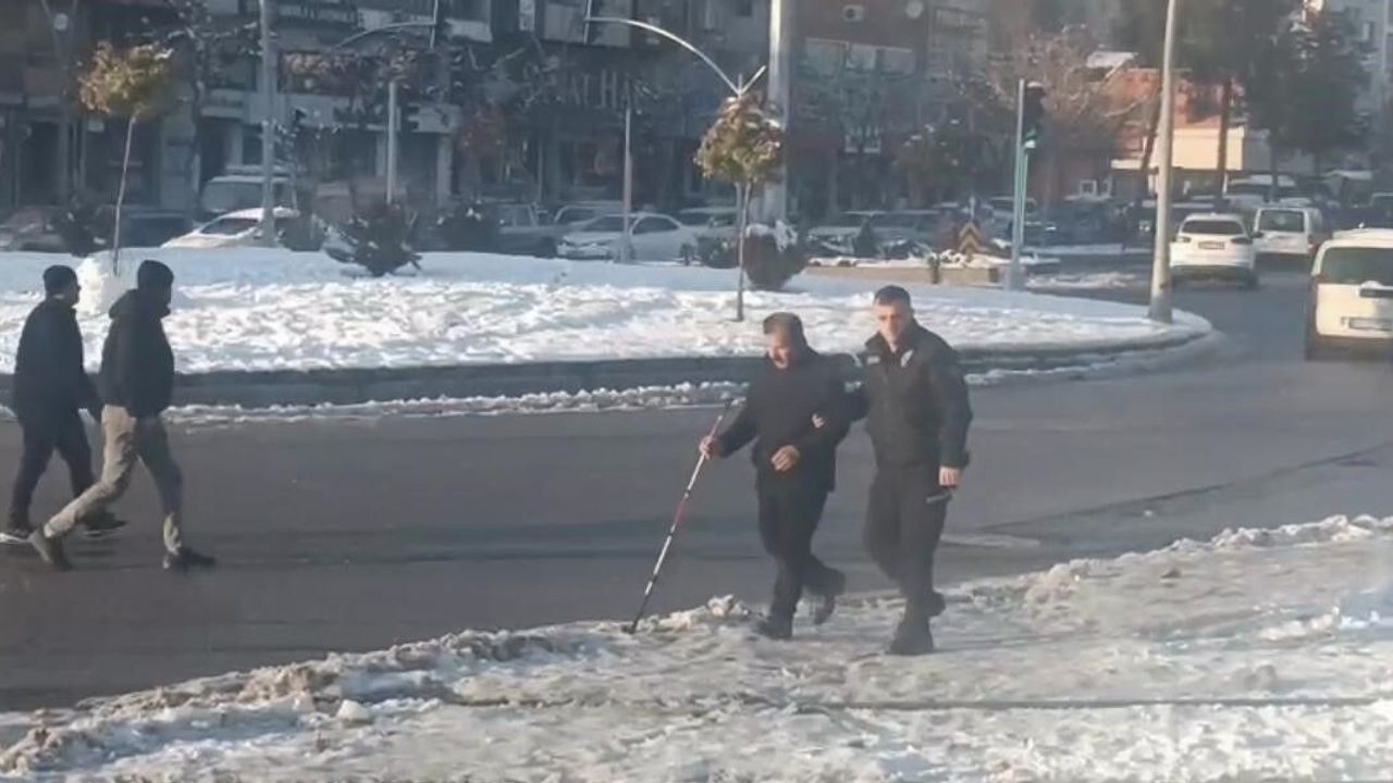 Batman'da kar yağışı nedeniyle kayganlaşan yolda yürümekte zorlanan görme engelli yaşlı vatandaşa çevik kuvvet polisi yardım etti. Polis memurunun vatandaşa markete kadar eşlik edip otobüse bindirdiği anlar takdir topladı.