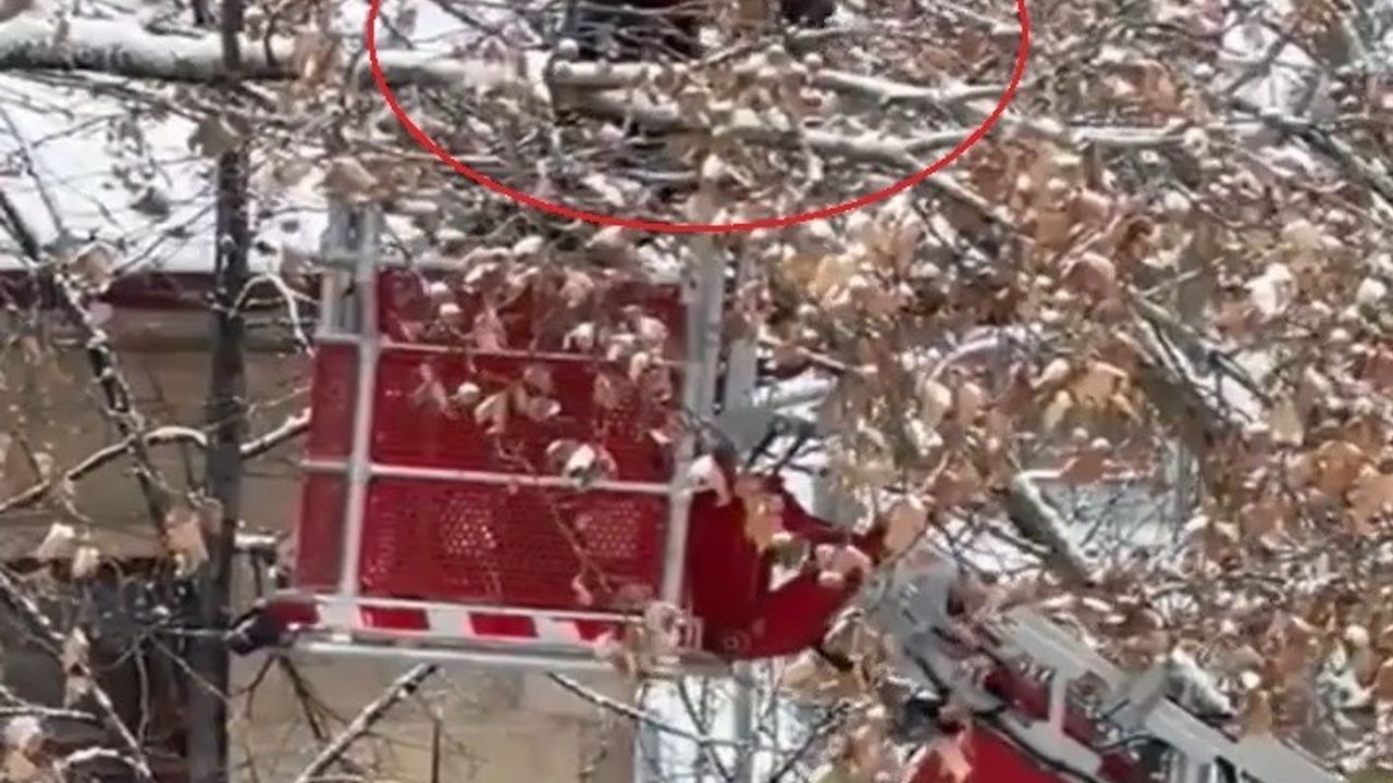Bayburt'ta ağaç dallarına takılan karga, itfaiye ekiplerinin çalışmasıyla kurtarıldı.