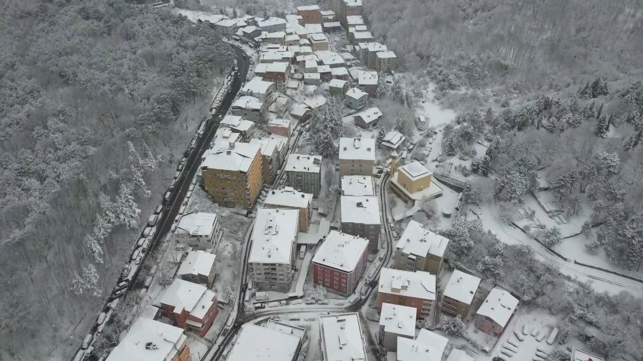 İstanbul Sarıyer'de etkili olan kar yağışı her yeri beyaz örtü ile kapladı. Kartpostallık manzara havadan görüntülendi.