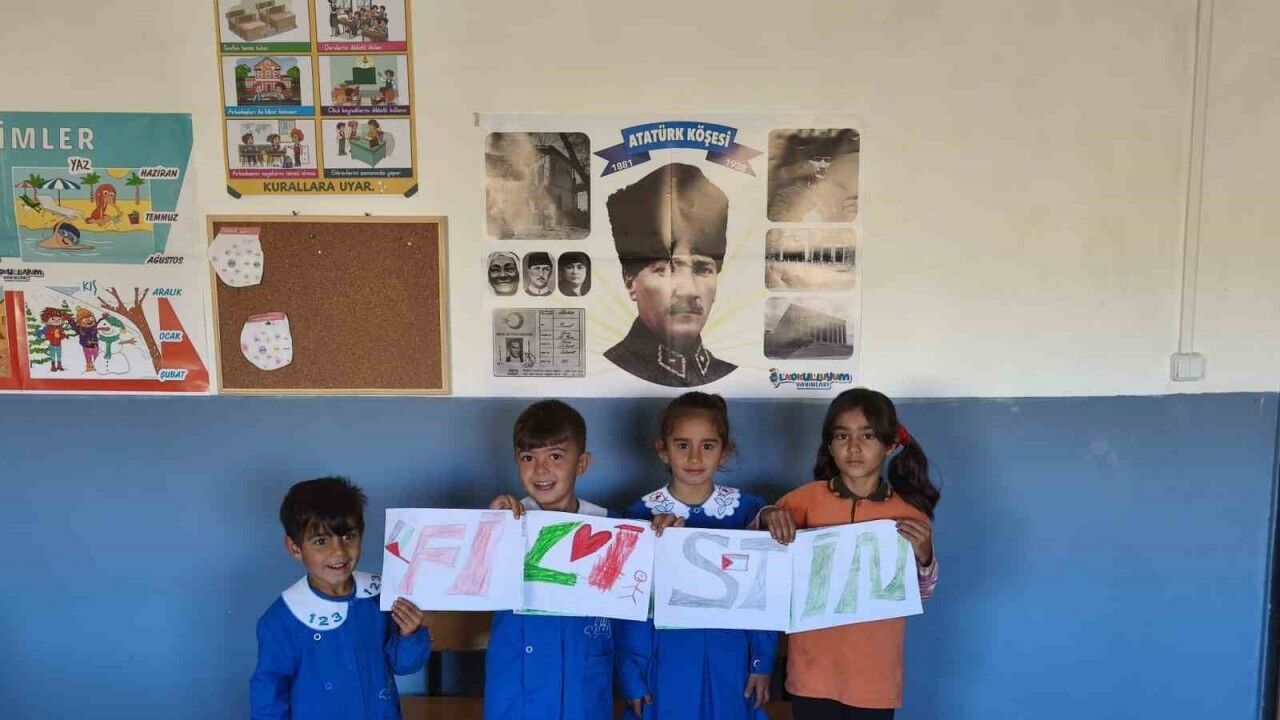 Köy okulunda okuyan minik öğrenciler, öğretmenlerinin rehberliğinde büyük bir duyarlılıkla Filistin’de yaşanan insan hakları ihlallerine dikkat çekti.