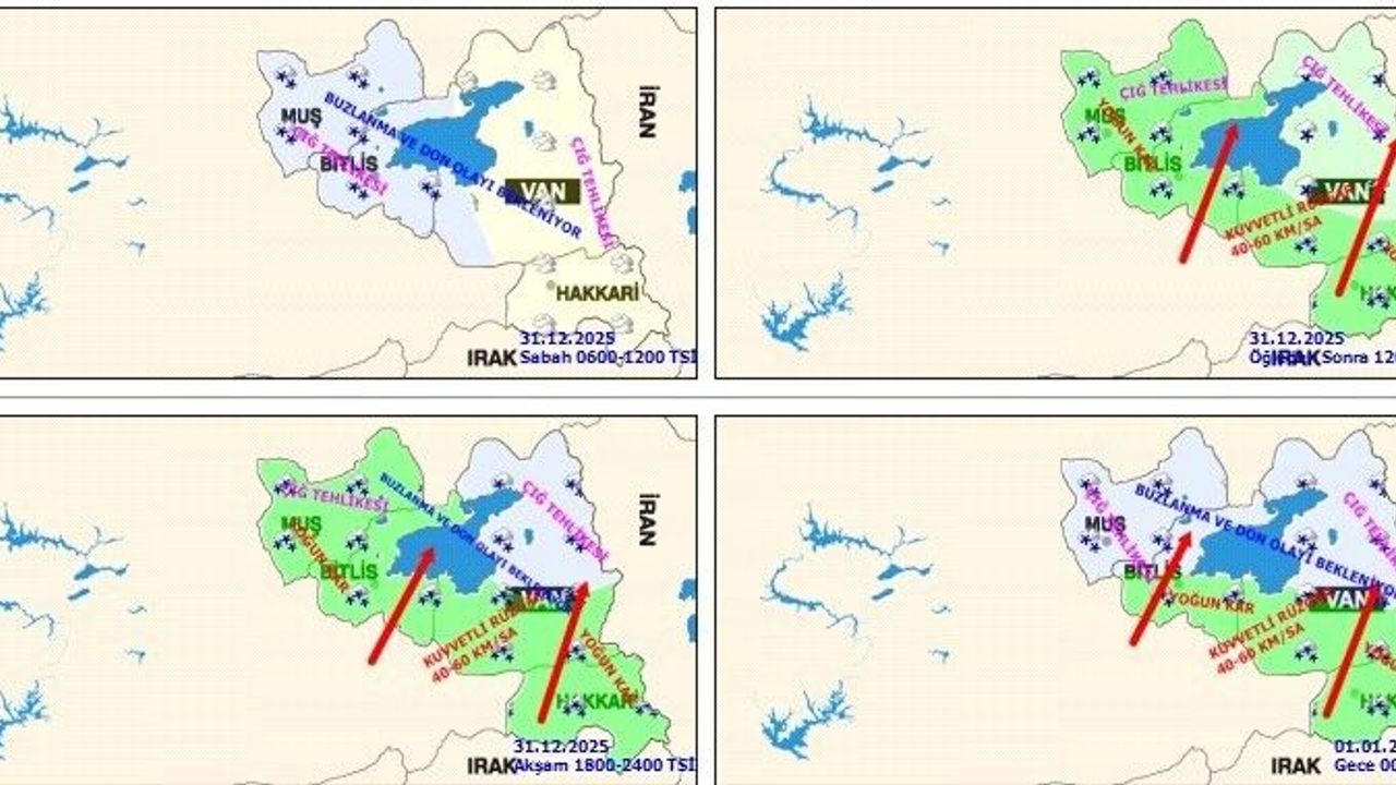 Meteoroloji 14. Bölge Müdürlüğünden alınan bilgilere göre, yapılan son değerlendirmede bölge genelinde havanın çok bulutlu, sabah saatlerinden itibaren Muş ve Bitlis çevrelerinde, öğle saatlerinden itibaren ise Van ve Hakkari çevrelerinde aralıklı kar yağışlı olacağı belirtildi. Yağışların öğle saatlerinden sonra yer yer kuvvetli ve yoğun kar şeklinde etkisini artıracağı dile getirilen açıklamada, 'Hava sıcaklıklarının mevsim normalleri civarında seyredeceği tahmin edilmektedir. Rüzgarın güneyli ve batılı yönlerden orta kuvvette, öğle saatlerinden itibaren zaman zaman kuvvetli rüzgar (40-60 km/sa) şeklinde esmesi beklenmektedir. Sabah ve gece saatlerinde buzlanma ve don olayı ile yer yer sis ve pus hadisesi beklendiğinden yaşanabilecek olumsuzluklara (ulaşımda aksamalar, görüş mesafesinde daralma vb.) karşı dikkatli ve tedbirli olunması gerekmektedir. Sabah saatlerinde başlaması beklenen yağışların öğle saatlerinden itibaren etkisini arttırarak Muş, Bitlis ve Hakkari çevreleri ile Van'ın güney (Edremit, Bahçesaray, Çatak, Gevaş, Gürpınar ve Başkale) ilçelerinde aralıklarla kuvvetli ve yer yer yoğun kar yağışlı olacağı tahmin edilmektedir. Yaşanabilecek olumsuzluklara karşı dikkatli ve tedbirli olunmalıdır. Bölgemizde yüksek kar örtüsü bulunan dik yamaçlarda çığ tehlikesi bulunduğundan yaşanabilecek olumsuzluklara karşı dikkatli ve tedbirli olunması gerekmektedir. Öğle saatlerinden itibaren bölgemiz genelinde rüzgarın güneyli yönlerden kuvvetli (40-60 km/sa), yüksek kesimlerde fırtına (60-80 km/sa) şeklinde esmesi beklendiğinden yaşanabilecek olumsuzluklara karşı dikkatli ve tedbirli olunmalıdır' denildi.