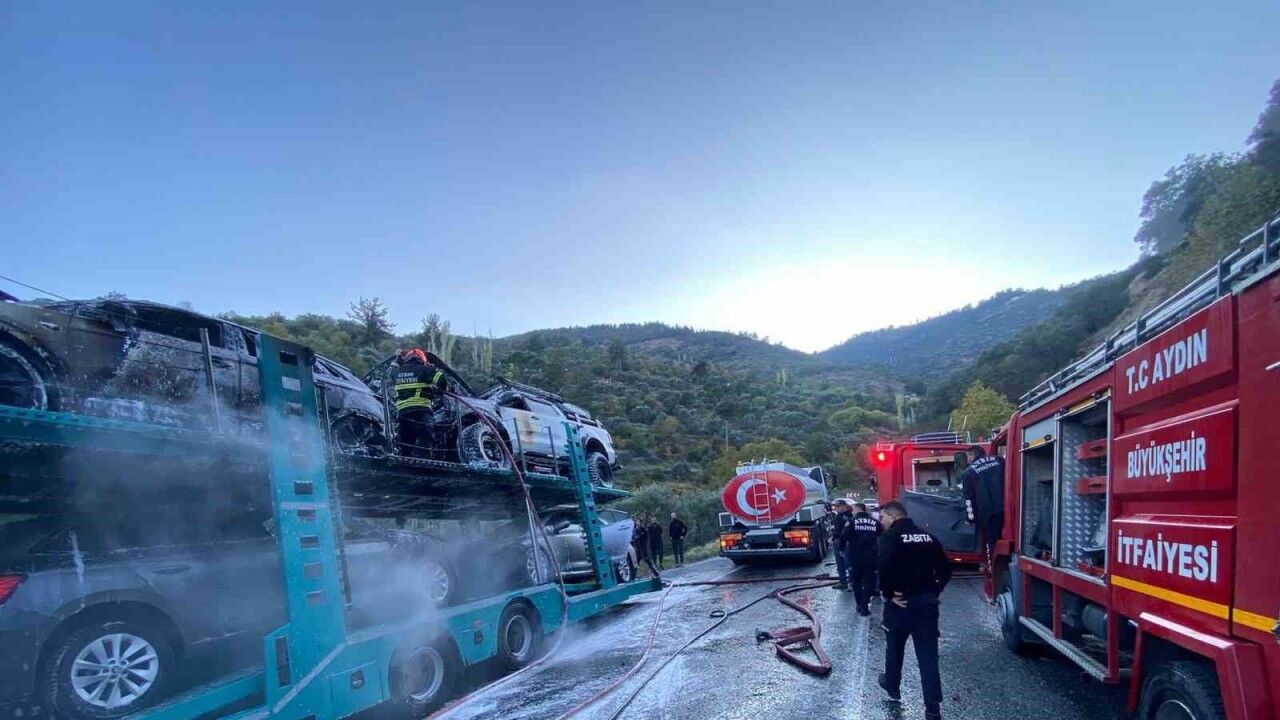 Olay, Bozdoğan ilçesi Altıntaş Mahallesi yolu üzerinde meydana geldi. Edinilen bilgiye göre üzerinde araç yüklü olan tırın dorse bölümünde henüz bilinmeyen bir nedenle yangın çıktı. Kısa sürede büyüyen yangın yüklü araçlara sıçradı. Alevleri fark eden tır sürücüsü, aracı yol kenarına çekerek durumu 112 Acil Çağrı Merkezi’ne bildirdi. İhbar üzerine bölgeye itfaiye ekipleri sevk edildi. Kısa sürede bölgeye gelen ekipler, yangını müdahale ederek söndürdü. Ekipler soğutma çalışması gerçekleştirirken, tırda yüklü olan araçlar da kullanılamaz hale geldi. Yapılan ilk incelemelere göre yangının tırın balatalarından çıktığı tahmin edilirken, kesin çıkış nedeninin belirlenmesi için inceleme başlatıldı.