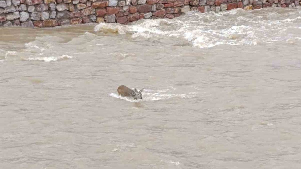 Yaralanmadığı belirlenen karaca, doğal yaşam alanına bırakıldı. Karacanın suda sürüklendiği anlar ise vatandaşlar tarafından cep telefonuyla görüntülendi.
