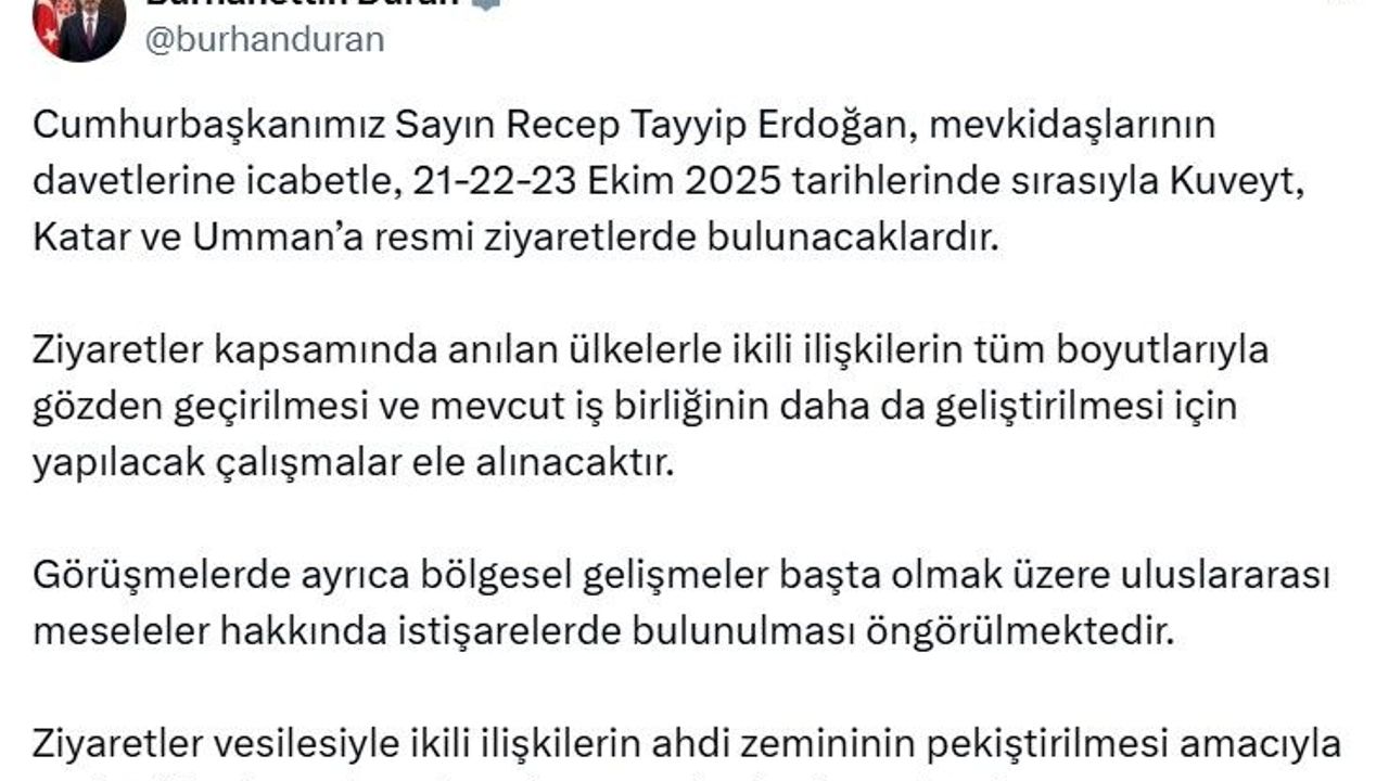Cumhurbaşkanı Recep Tayyip Erdoğan, 21-23 Ekim 2025 tarihlerinde Kuveyt, Katar ve Umman’a resmi ziyaretlerde bulunacak.