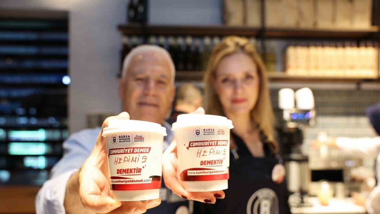 Eşi Seden Bozbey ile birlikte barista önlüklerini giyen Başkan Bozbey, Cumhuriyetin 102. yılına özel olarak hazırlanan ‘Cumhuriyet Demek’ temalı bardaklarda içecek ikramında bulundu. Vatandaşların isimlerini ‘Cumhuriyet demek’ temalı bardaklara yazan Başkan Mustafa Bozbey ve eşi Seden Bozbey, Atatürk’ün emanet ettiği Cumhuriyet’in sıcaklığını Bursalılarla birlikte paylaştı. Bu sene kutlamaların teması olan ‘Cumhuriyet demek, hepimiz demek’ sloganını da yazarak ikramda bulunan Başkan Bozbey ve eşi Seden Bozbey, kahve keyfini vatandaşlarla birlikte yaşadı.