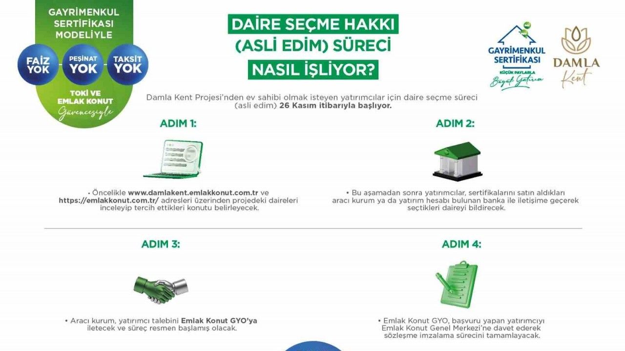 Emlak Konut GYO, Gayrimenkul Sertifikası modeliyle halka arz edilen Damla Kent Projesi’ne ilişkin olarak Kamuoyu Aydınlatma Platformu’nda (KAP) yaptığı açıklamada, yatırımcıların asli edim - daire seçimi haklarını 26 Kasım 2025 itibarıyla kullanmaya başlayabileceğini bildirdi. Projenin halka arz edilen etaplarında ihale süreçlerinin tamamlanması ve inşaat çalışmalarının başlamasıyla birlikte, Damla Kent’te yeni bir aşamaya geçilmiş oldu. Bu çerçevede, Gayrimenkul Sertifikası sahiplerinin beklediği asli edim - daire seçimi süreci yatırımcıların erişimine açılıyor.