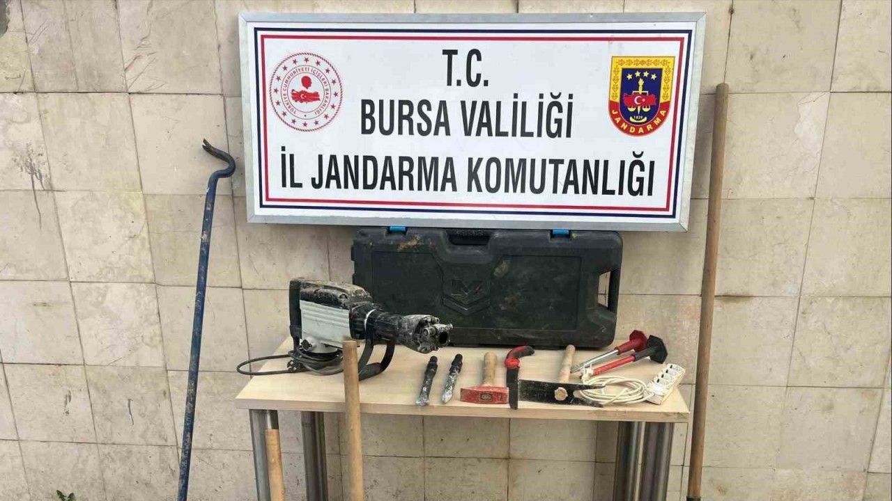 Bursa İl Jandarma Komutanlığı ekipleri, Gemlik İlçesi Şahinyurdu Mahallesi ormanlık alanında kaçak kazı yapıldığı ihbarı üzerin harekete geçti. Olay yerine giden ekipler, define arayan 4 kişiye suçüstü yaptı. Gözaltına alınan zanlılarla beraber, 1 adet jeneratör, 2 adet kırıcı ve delici matkap ve 13 adet muhtelif kazı malzemeleri ele geçirildi.