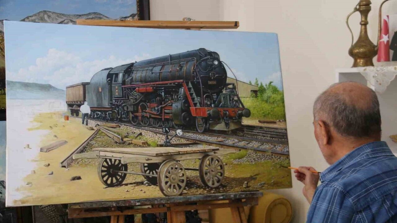 Sivas’ta çocukluğundan beri trenlerle iç içe olan ve 33 yıl Türkiye Cumhuriyeti Devlet Demiryolları’nda (TCDD) çalışan Arif Sayyar, emekli olduktan soınra tren sevgisini yaptığı yağlıboya tablolarda yaşatıyor.
