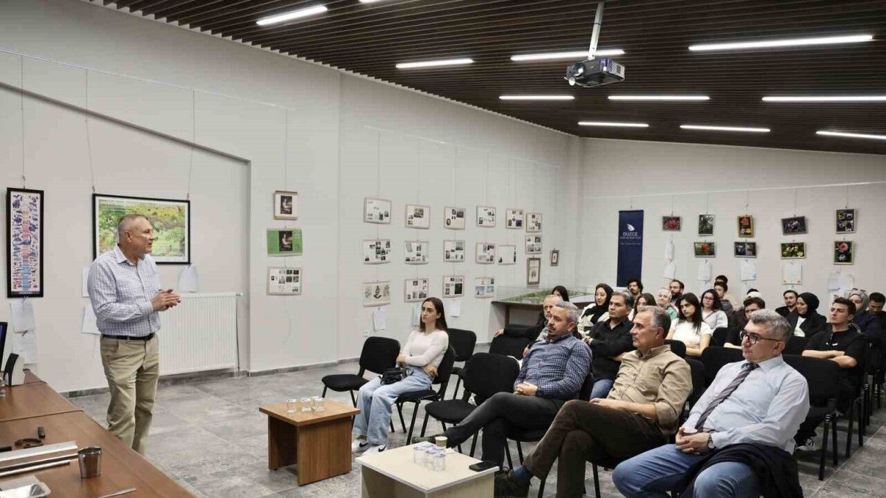 Konferansa; DÜSTİBAM Müdür Yardımcısı Prof. Dr. Engin Eroğlu, akademisyenler ve öğrenciler katılım sağlarken; Mühendislik Fakültesi Makine Mühendisliği Bölümü Öğretim Üyesi Prof. Dr. Oktay Elkoca, "Bahçe Uygulamalarında Metalik Malzemelerin Kullanımı" başlıklı konuşmasıyla etkinlikte yer aldı. Bahçe tasarımında malzeme seçiminin bir mekanın karakterini belirleyen temel unsurlardan biri olduğunu vurgulayarak konuşmasına başlayan Oktay Elkoca; bitkilerin doğallığı, yumuşaklığı ve değişkenliğine karşılık metal, taş ve ahşap gibi yapısal malzemelerin bu doğallığa denge, düzen ve kalıcılık kattığını ifade etti. Metalin estetik ve işlevsel açıdan bahçelerde üstlendiği güçlü rolü örneklerle ele alan Elkoca, paslanmaz çeliğin parlak yüzeyiyle modern bir kontrast oluşturduğunu, corten çeliğin sıcak pas tonlarının mekana derinlik kattığını, alüminyumun ise hafifliğiyle zarif bir görünüm sağladığını dile getirdi.