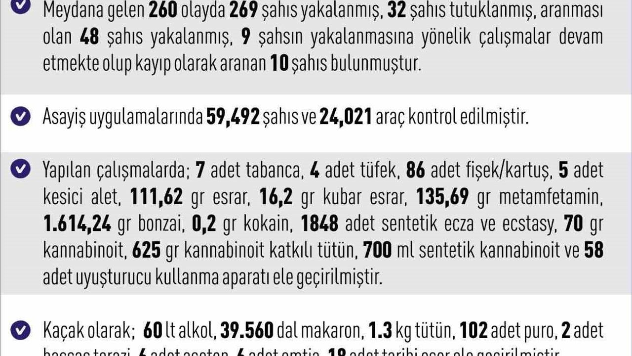 Elazığ Valiliği, 26 Ekim-2 Kasım 2025 tarihleri arasındaki haftalık asayiş verilerini açıkladı. Cumhuriyet Başsavcılığı koordinesinde güvenlik güçleri tarafından yapılan çalışmalarda kentte, 260 olayın meydana geldiği bildirildi. Bu olaylarda 269 şahıs yakalanırken, 32 kişi tutuklandı, aranması olan 48 kişi de gözaltına alındı. Ayrıca 9 şahsın yakalanmasına yönelik çalışmaların sürdüğü, 10 kayıp şahsın ise bulunduğu aktarıldı. Asayiş uygulamalarında 59 bin 492 şahıs ve 24 bin 21 araç kontrol edildi. Yapılan operasyonlarda 7 tabanca, 4 tüfek, 86 fişek, çok sayıda kesici alet, 1,6 kilogram bonzai, 135 gram metamfetamin, bin 848 sentetik hap ve 700 mililitre sentetik kannabinoid ele geçirildi.