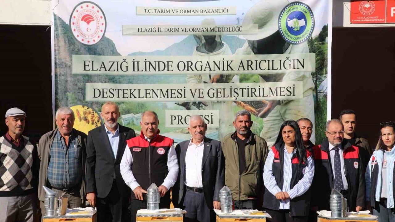 Organik arıcılığın desteklenmesi ve sürdürülebilirliğinin sağlanması amacıyla hazırlanan Organik Arıcılığın Desteklenmesi ve Geliştirilmesi Projesi, yüzde 75 desteği ve üreticilere yüzde 25 katkısı ile toplam 605 bin 400 TL bütçe ile hayata geçirildi. Proje kapsamında organik arıcılık yapan 15 üreticinin her biri için 10 adet organik boş kovan 5 kilo organik bal mumu, 6 litre varroa ilacı, maske, eldiven, körük, el demiri gibi ekipmanlar verilirken kontrol ve sertifikasyon hizmeti sağlandı. Dağıtım törenine, İl Tarım ve Orman Müdürü Saadettin Taşkesen, Elazığ Arı Yetiştiricileri Birliği Başkanı Kimyager Fırat Canbay, şube müdürleri, STK temsilcileri, üreticiler ve teknik personel katıldı.