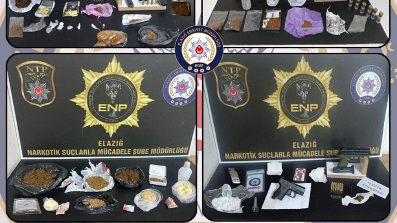 Elazığ Cumhuriyet Başsavcılığı koordinesinde İl Emniyet Müdürlüğü Narkotik Suçlarla Mücadele ve Asayiş Şube Müdürlüğü tarafından uyuşturucu ile mücadele çalışmaları sürüyor. Bu çerçevede son 20 gün içerisinde uyuşturucu madde kullanan ve uyuşturucu madde ticareti yapan şahıslara yönelik yapılan operasyonlarda; 39 parça halinde 1 kilo 570 gr sentetik kannabinoid maddesi, 7 parça halinde 57.40 gram metamfetamin maddesi, 8 parça halinde 41 gamr esrar maddesi, 2 bin 650 adet sentetik ecza maddesi, 3 adet ruhsatsız tabanca ve tabancalara ait 51 adet fişek, 1 adet ruhsatsız pompalı tüfek ve 6 adet kartuş ile 1 adet hassas terazi ele geçirildi.