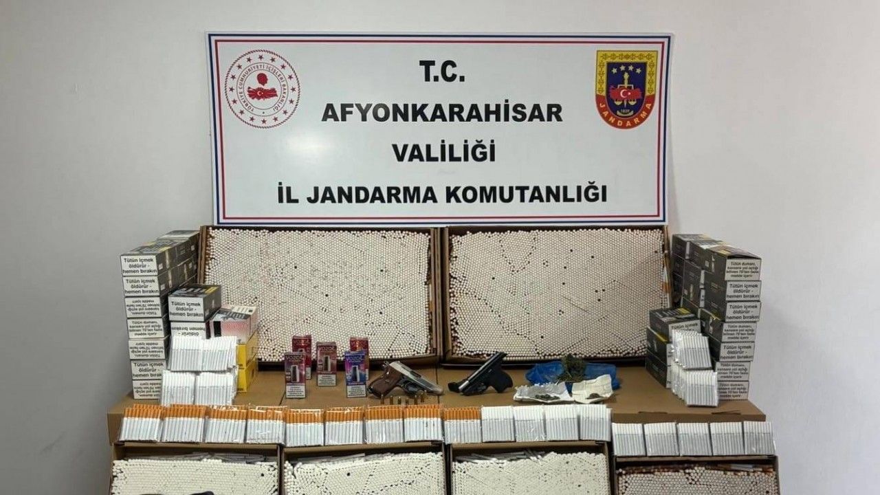 Afyonkarahisar’da jandarma tarafından iki farklı adrese yapılan baskında 18 gram esrar, 73 bine yakın doldurulmuş kaçak makaron ve ruhsatsız silah ele geçirildi.