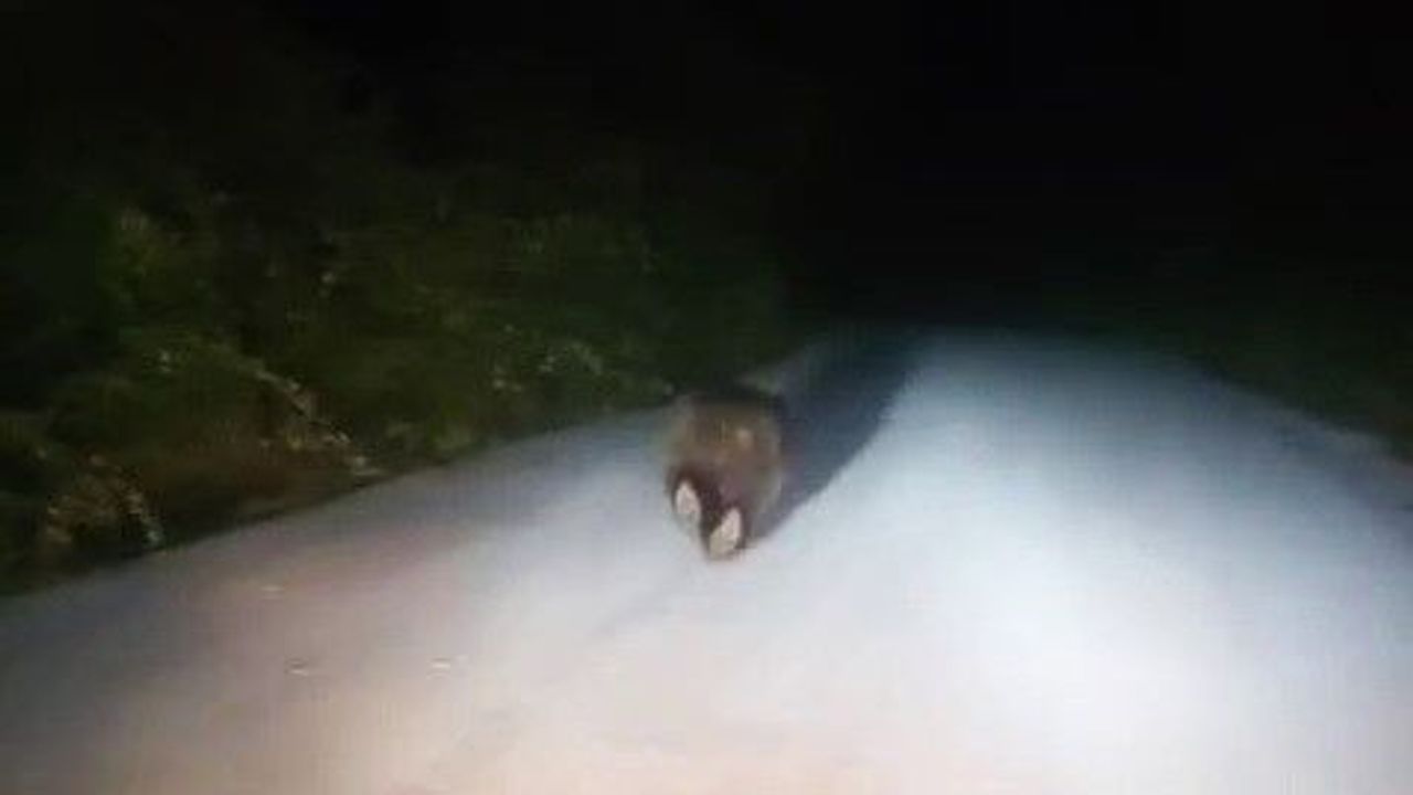 İlçeye bağlı Ovaşeyhler Köyü yolunda ilerleyen vatandaşlar, bir süre önlerinde koşan ayıyı görünce o anları kaydetti. Ayının dakikalarca araç önünde koştuğu anlar görüntülere yansırken, kaydı yapanların "Dayı buradan Antalya’ya gidilir mi?" şeklindeki esprili sözleri gülümsetti.