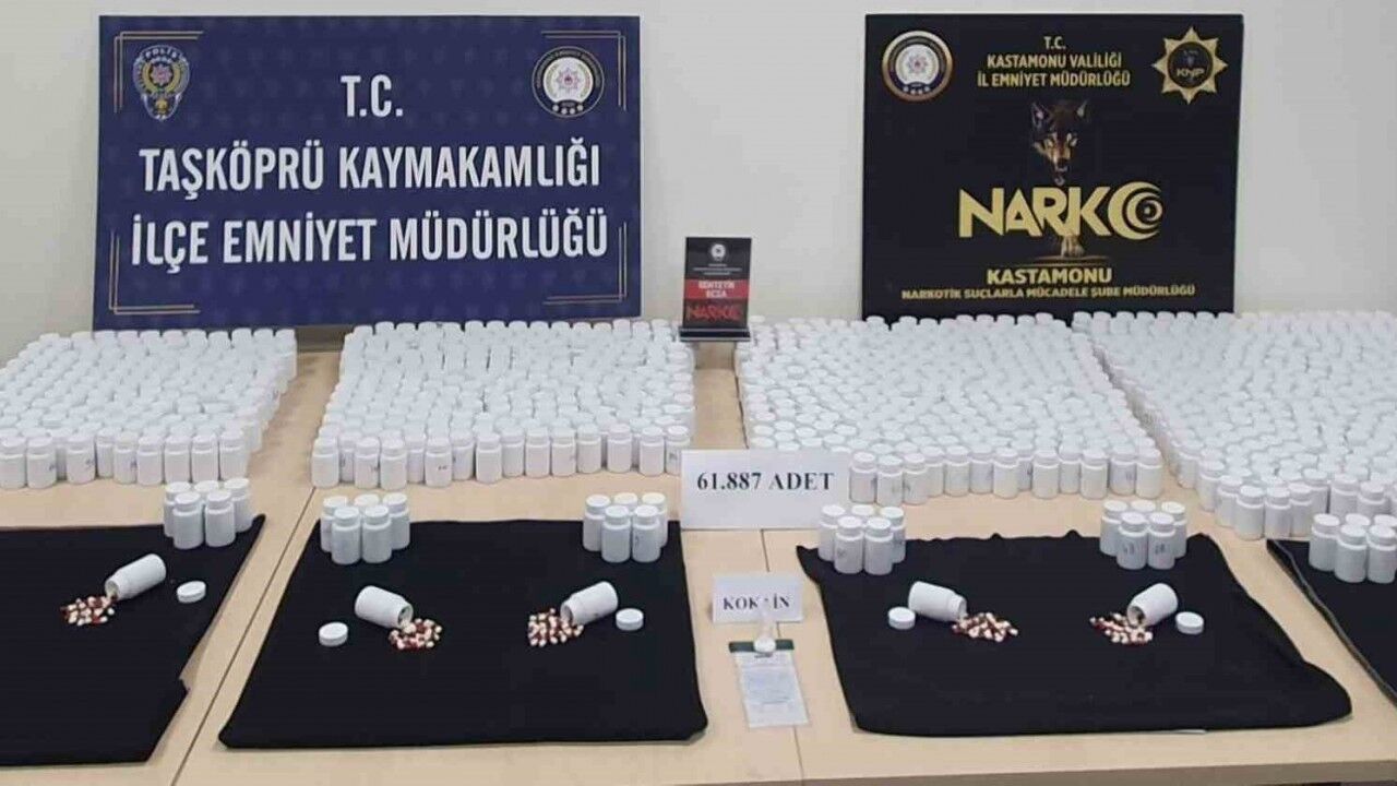 Edinilen bilgiye göre, Kastamonu İl Emniyet Müdürlüğü ile Taşköprü İlçe Emniyet Müdürlüğü ekiplerince şüphe üzerine iki araç durdurularak arama yapıldı. Taşköprü ilçesinde durdurulan iki araçta yapılan aramalarda 3 gram kokain ve 61 bin 877 adet sentetik ecza hapı ele geçirildi.