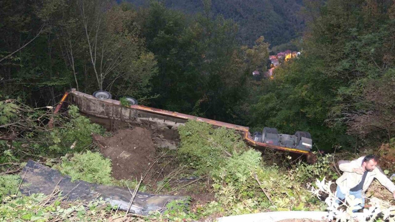 Kastamonu’nun Bozkurt ilçesinde iş makinesi yüklü tırın şarampole devrildiği kazada sürücü yaralandı.