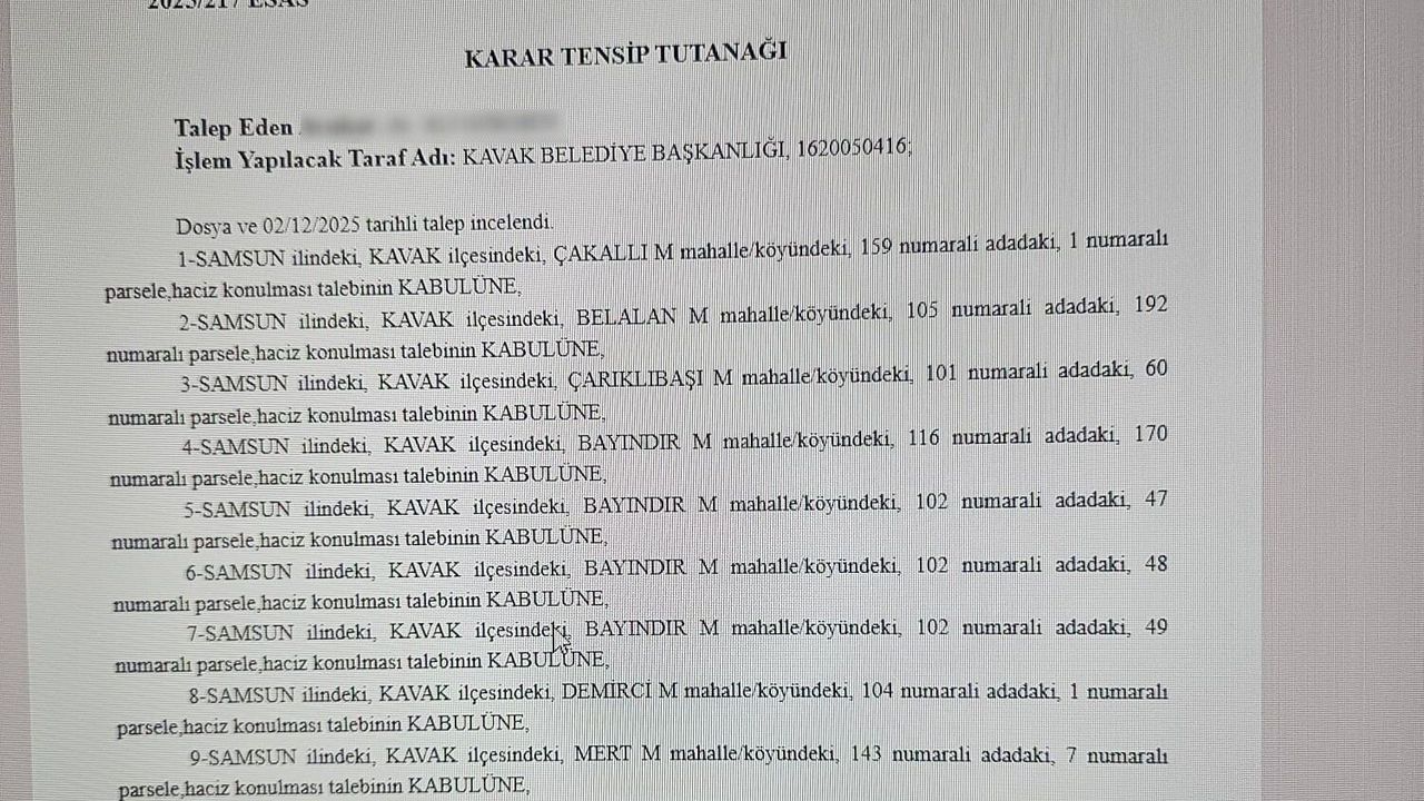 Mahkeme, 02 Aralık 2025 tarihli talep doğrultusunda Kavak'ın Çakallı, Belalan, Çarıkbaşı, Bayındır, Demirci, Mert ve Karadağ mahallelerinde bulunan ada ve parsel numaraları belirtilen gayrimenkullere haciz konulmasını kabul etti. Kararda, toplam 10 taşınmaz hakkında haciz talebinin yerinde bulunduğu ifade edildi.