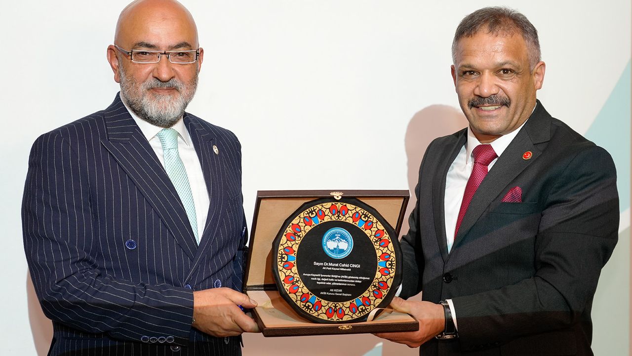 Görüşme sonunda AKİB Başkanı Ali Hızar tarafından Dr. Cıngı’ya “AKİB Onursal Başkanlığı” payesi takdim edildi.