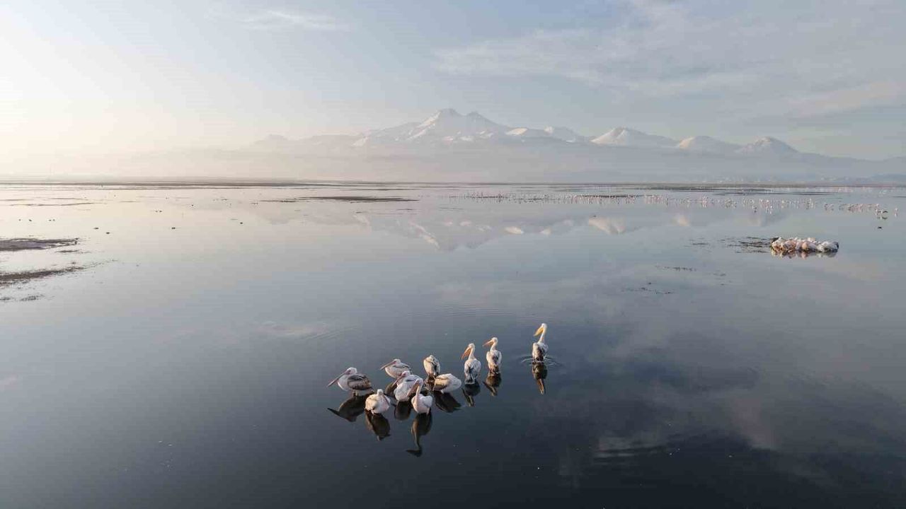 Baharın gelmesiyle birlikte Kayseri'ye adım atan ilk pelikan grubu dronla görüntülendi.