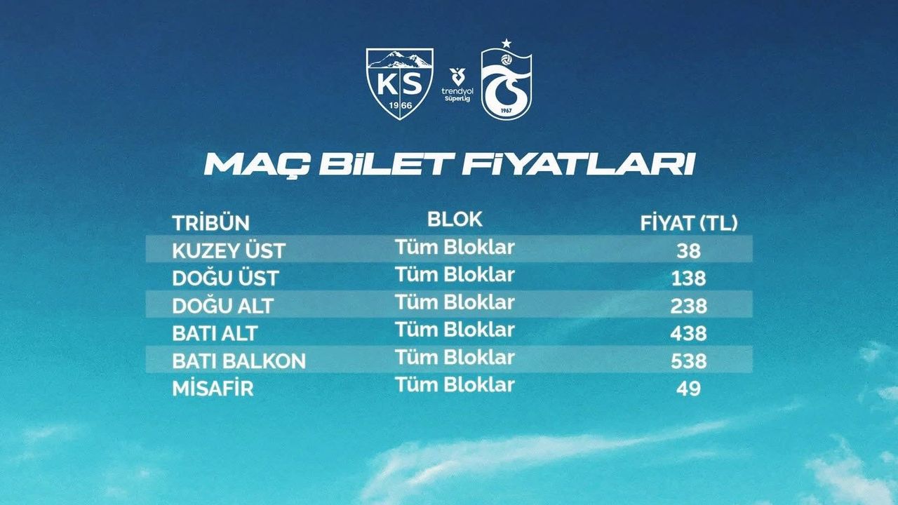 Açıklanan bilet fiyatlarına göre kuzey üst tribünü tüm bloklarda 38 TL, doğu üst tribünü tüm bloklarda 138 TL, doğu alt tribünü tüm bloklarda 238 TL, batı alt tribünü tüm bloklarda 438 TL, batı balkon tribünü tüm bloklarda 538 TL ve misafir tribünü tüm bloklarda 49 TL olarak belirlendi.