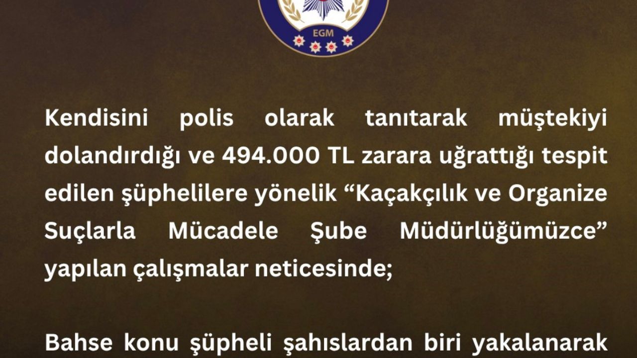 Bingöl İl Emniyet Müdürlüğü’nden yapılan açıklamada, "Kendisini polis olarak tanıtarak müştekiyi dolandırdığı ve 494.000 TL zarara uğrattığı tespit edilen şüphelilere yönelik Kaçakçılık ve Organize Suçlarla Mücadele Şube yapılan çalışmalar neticesinde; müdürlüğümüzce bahse konu şüpheli şahıslardan biri yakalanarak ‘Nitelikli Dolandırıcılık’ suçundan sevk edildiği mahkemece tutuklanmıştır" denildi.
