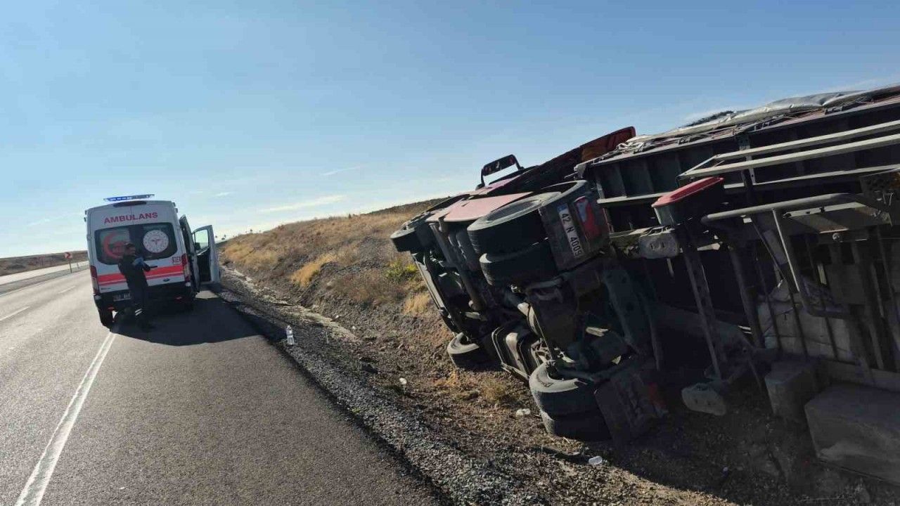 Konya’nın Kulu ilçesi yakınlarında kontrolden çıkarak devrilen tırın sürücüsü hafif yaralandı.