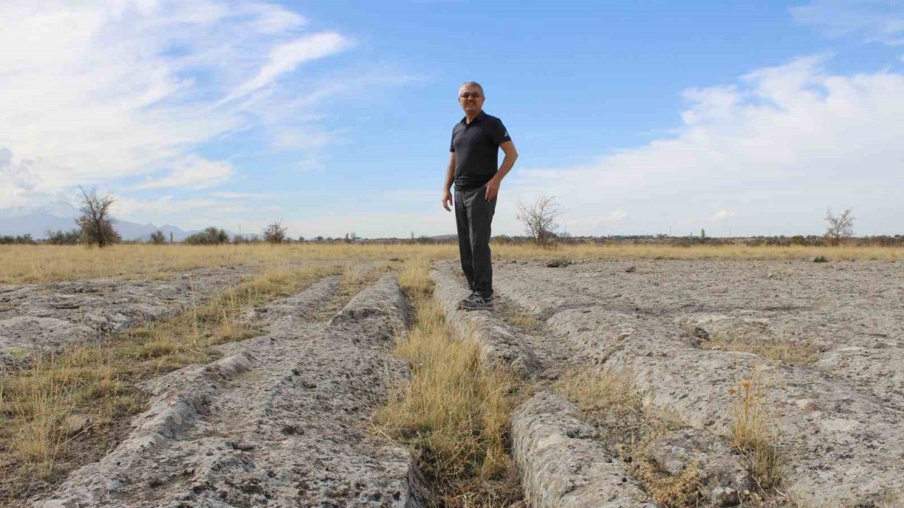 Turan Mahallesi’nde bulunan izlerin kağnı izleri olduğunu düşündüklerini ancak literatürde henüz bununla ilgili bir çalışma yapılmadığını sözlerine ekleyen Prof. Dr. Osman Özsoy, "Şu anda, Turan’ın güneybatı istikametinde, mahalle merkezine yaklaşık 2 kilometre mesafede bir yerdesiniz. Burada çeşitli izler var. İzler belirgin ve derinliklere sahip. İzler arasındaki mesafeler genellikle çok bilindik ve rastgele olmayan mesafeler. Biz buranın savaşta, ticarette ya da barışta kullanılan bir atlı araba veya öküzlü araba yolu olduğunu tahmin ediyoruz. Engir Gölü çevresinde, Kültepe-İldem aksında da böyle bir alanın olduğunu biliyoruz. Burası, güvenli olduğu için tercih edilmiş. Altyapısı, araçların yüklü veya yüksüz şekilde geçmelerine müsaade ettiği için tercih edilmiş. Yıllar içerisinde çok fazla kullanılmasından dolayı, yüklü ya da yüksüz, buradan onlarca ve binlerce kağnı geçmekte. Kağnılar; bu yolları kaya olsa dahi zaman içerisinde aşındırmış. Tekerleklerin neredeyse yarı çapı yüksekliğinde dikey olarak gördüğümüz uzunluklarda çukurlar oluşturmuşlar. İki tekerleğin merkezine doğru olan uzaklık ile buradaki iki çizgi arasındaki mesafe hemen hemen aynıdır. Bu durum da bu tezi doğrulamaktadır. Bazen 10 ya da 20 tane yol çizgisinin bir arada olduğunu görebiliyoruz. Aşınmayla beraber, farklı yollar tercih edilmiş. Çok yoğun olduğu durumlarda karşı karşıya gelmemek ve yükün gecikmemesi için böyle yollar tercih edilmiştir. Bu değerin burada varlığı, Koramaz Vadisi ve Turan Mahallesi’ne ekstra bir zenginlik katmaktadır. Bölgedeki sıkışık Ağırnas ve Koramaz Vadisi aksındaki ziyaretlere ek olarak, köylülerimizin çok iyi bildiği bu yerleri de ziyarete kazandırmak, görmelerini sağlamak ve korumak çok önemli bir unsur olarak karşımıza çıkmaktadır. Bazı noktalarda kesintiler görüyoruz. Yükseltiler arasında, peynir kesercesine dümdüz kesildiğini görüyoruz. Değirmen taşı niteliğinde yuvarlak geometriye sahip taşlar, yerden 30 santimetre yükseklikte olduğu için kesilmiş ve taşınmış olduğu yerden uzaklaştırılmış. Boydan boya takip ederseniz, bazı izlerin çok belirgin olduğunu görürsünüz. Toynak ya da nal izi olarak düşünülebilir. Aynı yere basan taşıyıcı hayvanların, diğer kağnı tekerleklerinin yol yapması gibi, onlar da burada kendi izlerini bırakmışlar. Bu durumla ilgili literatürde hiçbir çalışma yok. Koramaz Vadisi’ni ya da şehri düşündüğümüzde, daha detaylı çalışmalar yapılacağı umudunu taşıyoruz" ifadelerini kullandı.