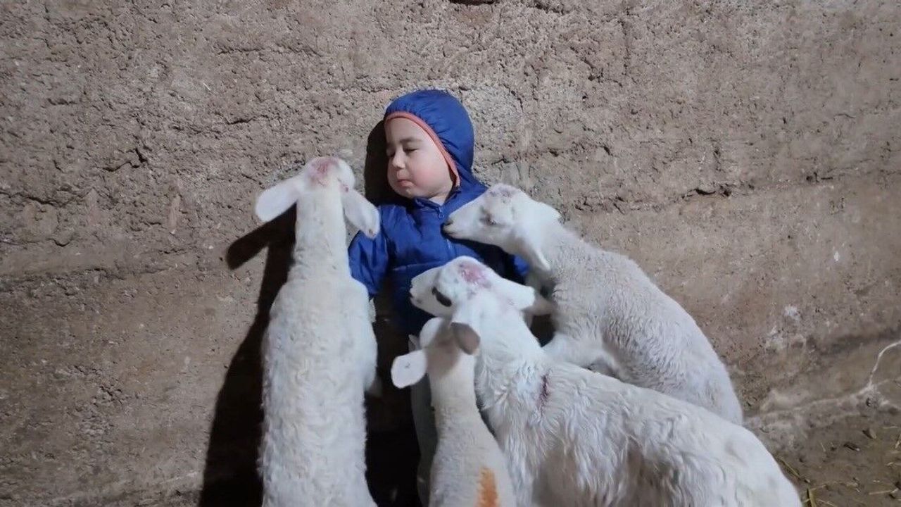 Eskişehir’in Seyitgazi ilçesine bağlı Çukurca Mahallesinde yaşayan Orhun Topkaya, çiftçilik ve hayvancılık yaparak hayatını sürdürüyor. Topkaya’nın minik Yusuf Alp isimli 3 yaşındaki oğlunun başına geçtiğimiz günlerde tebessüm ettiren bir olay geldi. Koyunlarını ağıla süren Orhun Topkaya’nın oğlunun etrafını çeviren kuzular, 24 Kasım’da 3 yaşına basan Yusuf Alp’in elindeki simitten parça koparıp, çocuğun yüzünü yaladı. O anları kaydeden babası Orhun Topkaya ise kahkahalar içinde kaldı. Oğluna, "Kuzular ne yapıyor sana?" sorusuna minik Alp, "Kuzular beni yiyorlar" cevabını vermesi yüzleri gülümsetti.
