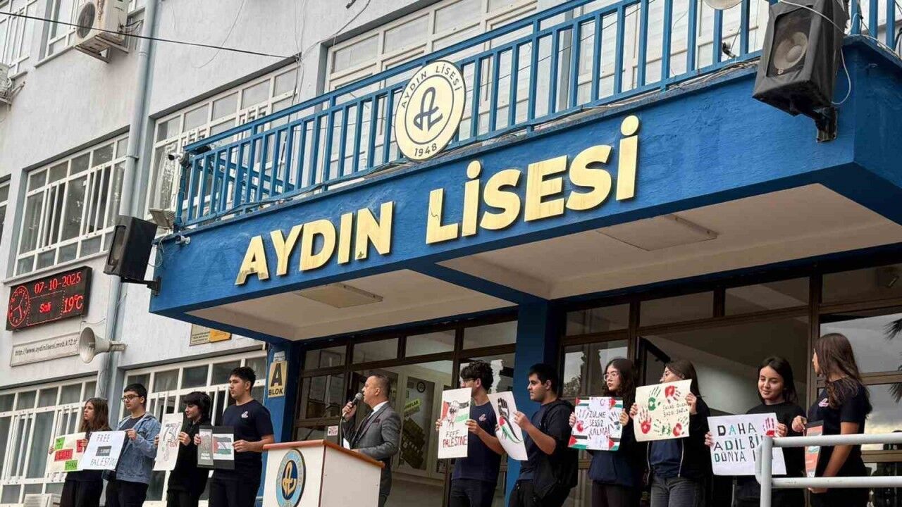 Aydın Lisesi öğrencileri İsrail’in Filistin’deki saldırılarına dikkat çekmek amacıyla okul bahçesinde protesto düzenledi. Ellerinde pankartlar bulunan gençler, Gazze’de yaşanan insanlık dramına karşı sessiz kalmamayı tercih etti.