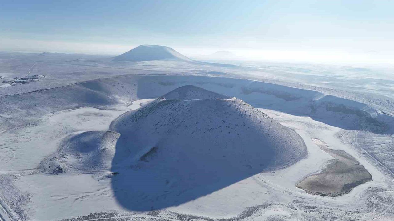 Konya'nın Karapınar ilçesinde bulunan Meke Gölü, kar yağışının ardından beyaz gelinliğini giyerek kartpostallık manzaralar oluşturdu. Meke Krater Gölü, fotoğrafçılar, doğa tutkunları ve tatilcilerin büyük ilgisini çekiyor.
