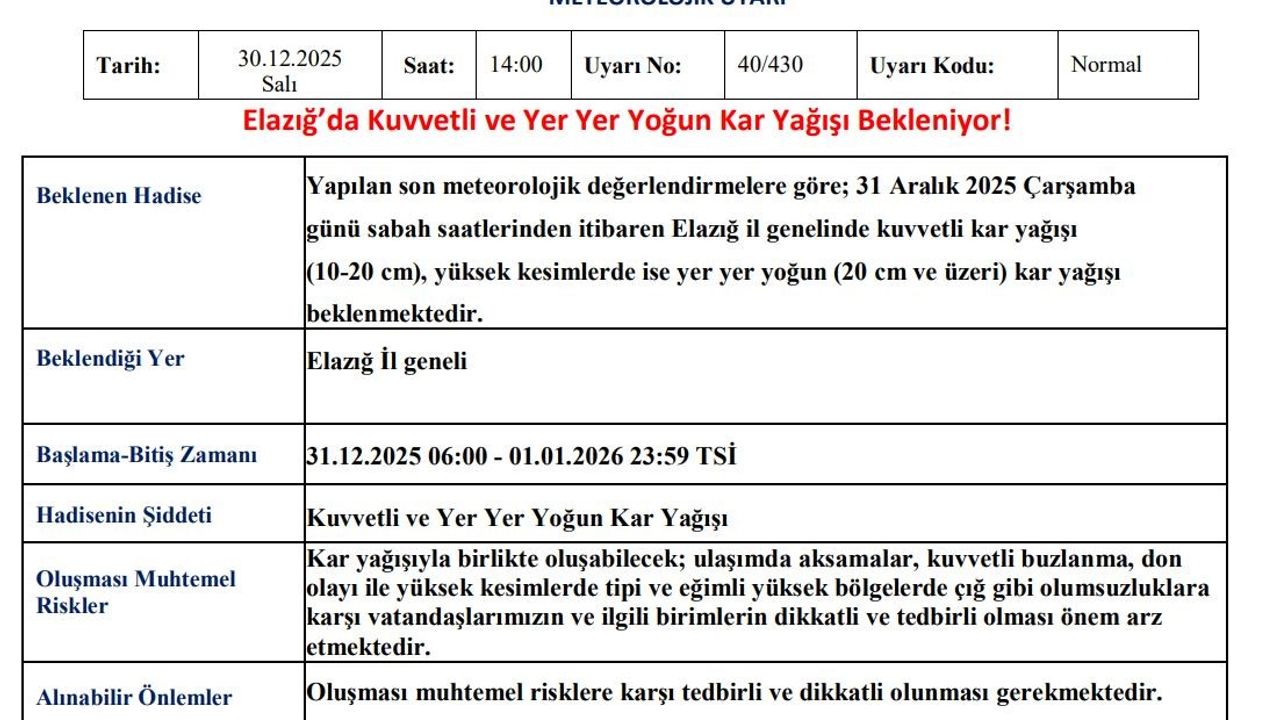 Meteoroloji 13. Bölge Müdürlüğü'nden yapılan açıklamada, 'Yapılan son meteorolojik değerlendirmelere göre; 31 Aralık 2025 Çarşamba günü sabah saatlerinden itibaren Elazığ il genelinde kuvvetli kar yağışı (10-20 cm), yüksek kesimlerde ise yer yer yoğun (20 cm ve üzeri) kar yağışı beklenmektedir. Kar yağışıyla birlikte oluşabilecek; ulaşımda aksamalar, kuvvetli buzlanma, don olayı ile yüksek kesimlerde tipi ve eğimli yüksek bölgelerde çığ gibi olumsuzluklara karşı vatandaşlarımızın ve ilgili birimlerin dikkatli ve tedbirli olması önem arz etmektedir' denildi.