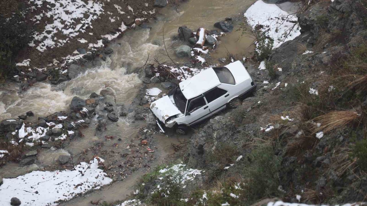 Hatay'da kayganlaşan zeminde sürücüsünün kontrolünü kaybettiği Tofaş marka otomobil, metrelerce uçurumdan dereye uçtu. Dereye uçan otomobil sürücüsü, son anda kendini araçtan atarak kurtardı.