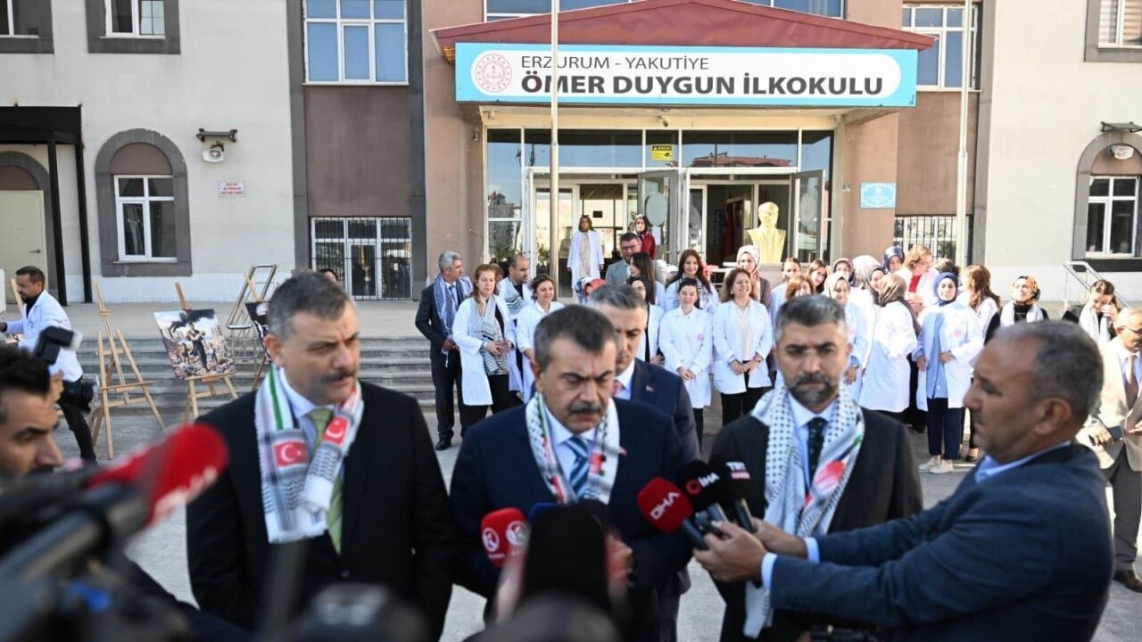Milli Eğitim Bakanlığı olarak bugün soykırımın ikinci yıldönümünde okullarda böyle bir etkinliği yapmayı uygun bulduklarını anlatan Bakan Tekin, "Biliyorsunuz son günlerde özellikle sadece ve sadece insani yardım amaçlı dünyanın farklı ülkelerinden, farklı milletlerden, farklı etnik ve dini aidiyetlerden insanların insani yardım götürmek üzere insan hakları aktivisti olarak yaptıkları eylemler İsrail vahşi politikası tarafından engellendi. Bu konuda da sesimizi duyurmak istemiştik. Türkiye’nin genelinde öğretmen arkadaşlarımızdan, okullarımızdan böyle bir gönüllü etkinlik ortamı oluşturulsun istemiştik. Biz de bugün burada Erzurum’da öğretmen arkadaşlarımızla bu etkinlikleri birlikte yaptık. Emeği geçen bütün öğretmen arkadaşlarımıza bu konuda hassasiyetini bizimle paylaşan bütün sivil toplum örgütlerine, siyasilere burada şükranlarımı sunuyorum. Eğitim dediğimiz gibi hep beraber altından kalkabileceğimiz bir yük. İnşallah biz bu paylaşımcı mantıkla dünyanın ortak ve yaşanabilir bir dünya haline gelmesi için insan haklarını, adaleti, demokrasiyi önceleyen bir eğitim anlayışı inşa etmeye hep beraber devam edeceğiz" şeklinde konuştu.