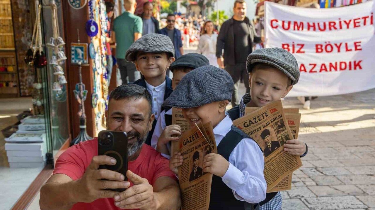 Antalya’nın Manavgat ilçesinde 29 Ekim Cumhuriyet Bayramı dolayısıyla düzenlenen etkinlikte, Manavgat Belediyesi Side Kreş ve Gündüz Bakımevi öğrencileri renkli görüntülere sahne oldu. Minik öğrenciler, hazırladıkları "Cumhuriyet ilan edildi" manşetli sembolik gazeteleriyle Antik Side sokaklarında dolaşarak vatandaşlara Cumhuriyet coşkusunu yaşattı.