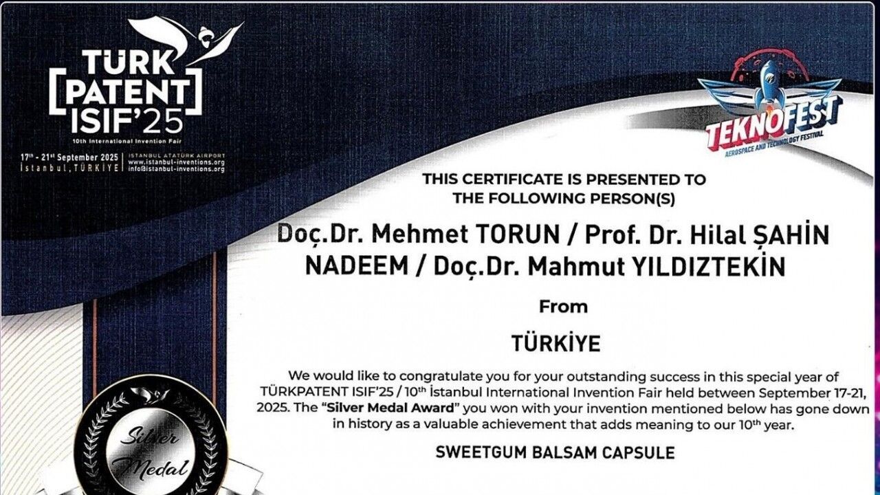 Muğla Sıtkı Koçman Üniversitesi (MSKÜ) Köyceğiz Meslek Yüksekokulu öğretim üyesi Doç. Dr. Mahmut Yıldıztekin, "Sığla Yağı Kapsülü" patentiyle TÜRKPATENT ISIF’25 Uluslararası Buluş Fuarı’nda Gümüş Madalya kazandı.