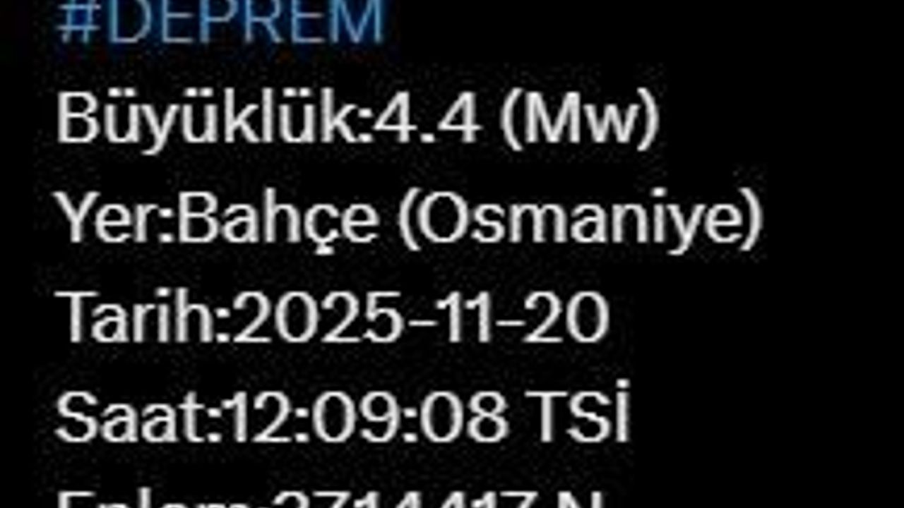 AFAD’ın paylaştığı bilgilere göre, Osmaniye’nin Bahçe ilçesinde saat 12.09’da 4.4 büyüklüğünde deprem meydana geldi. Merkezi Bahçe olan depremin derinliği 8.8 kilometre olarak ölçüldü.